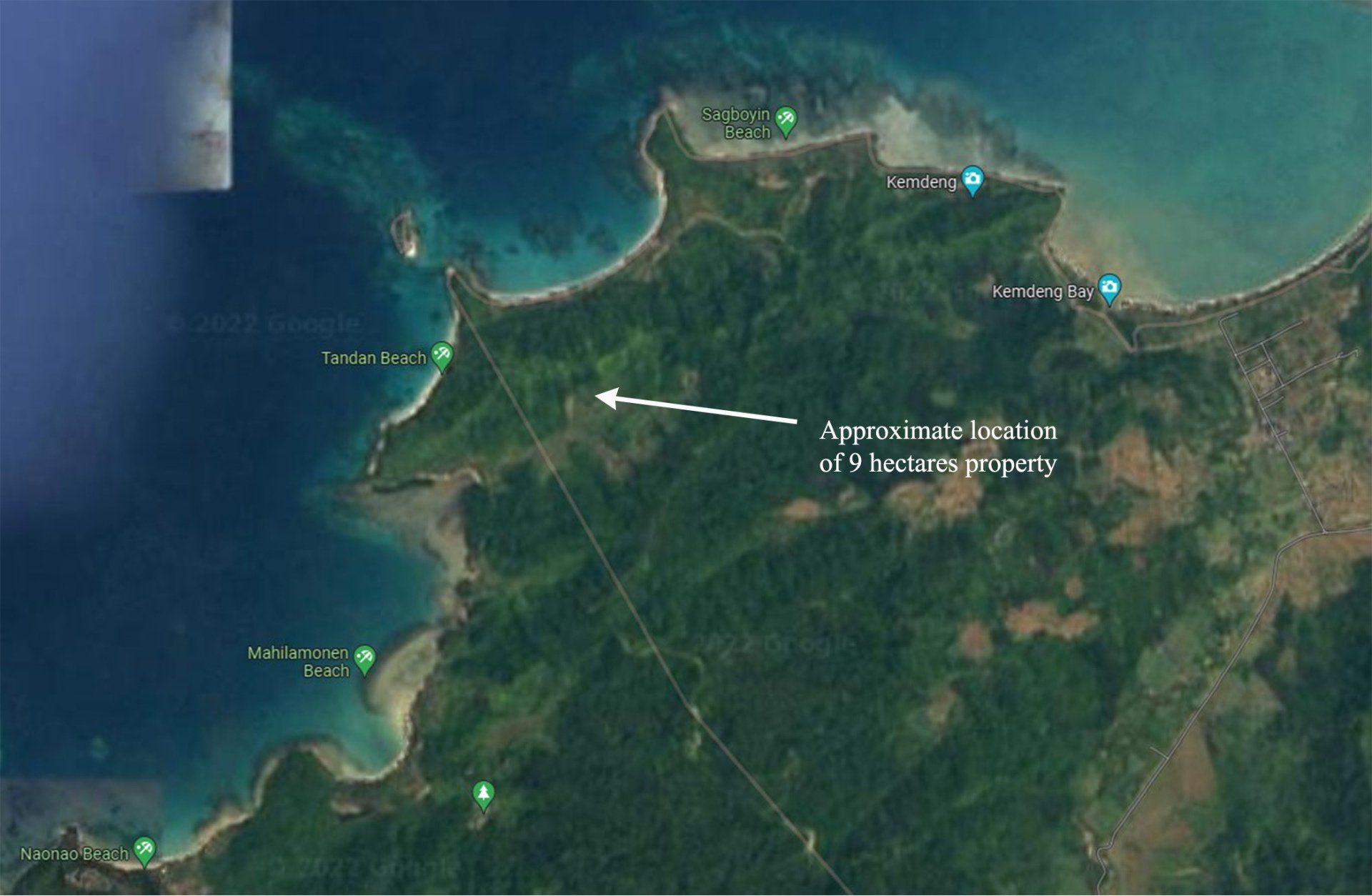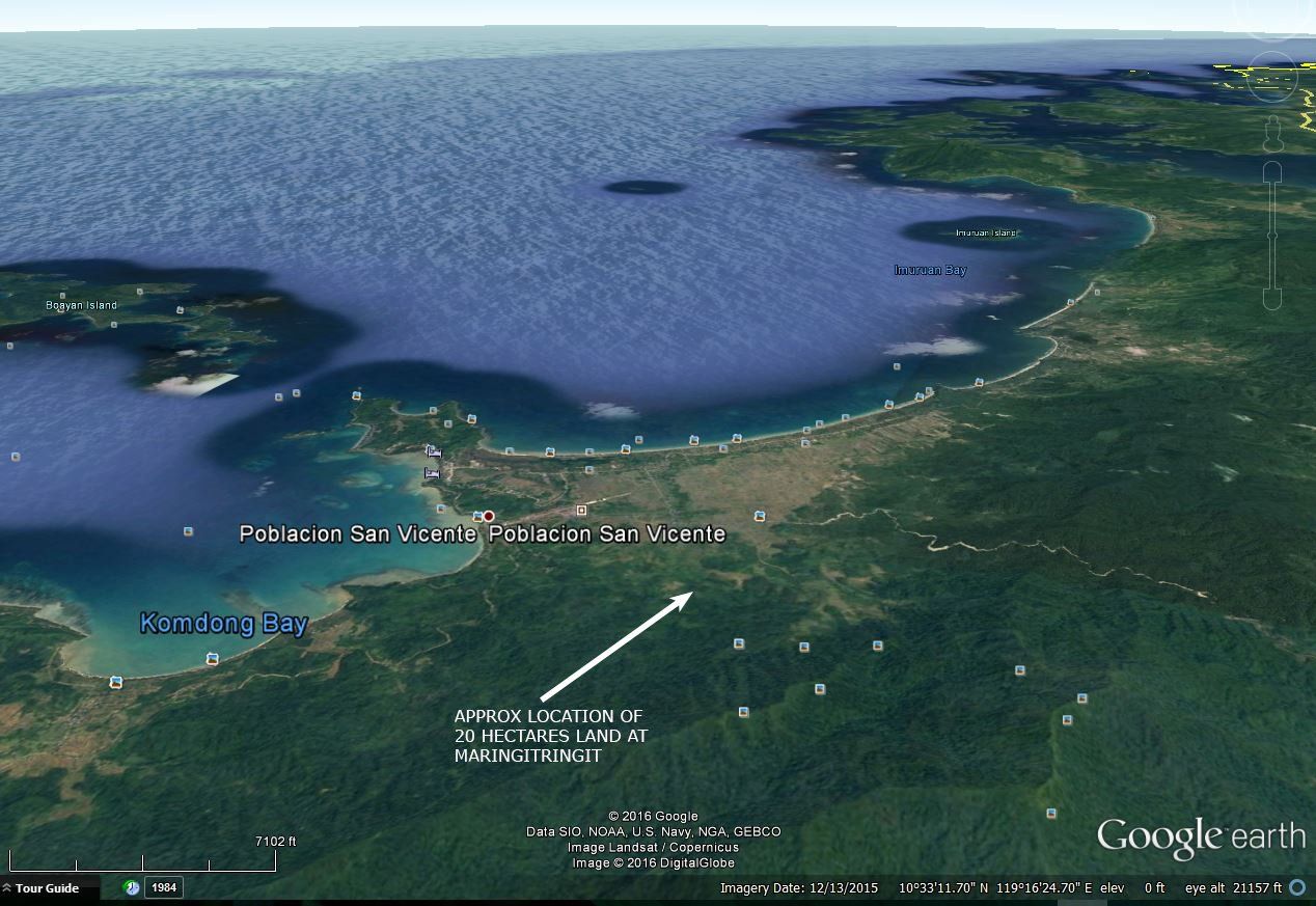This is an agricultural and ecotourism land located at sitio Tandan, between barangays Kemdeng/Port Barton, San Vicente, Palawan. The pristine beach of Tandan is only 800 meters away. This property is in front of a concrete highway and 15 to 20 minutes away to Port Barton. The road frontage is about 800 meters. There is big potential for coconut, coffee, durian, banana, and fruit bearing trees plantation, ideal for commercial development in front of the highway, mountain resort development, reforestation of industrial trees, ecotourism, and plantation for fruit bearing trees.