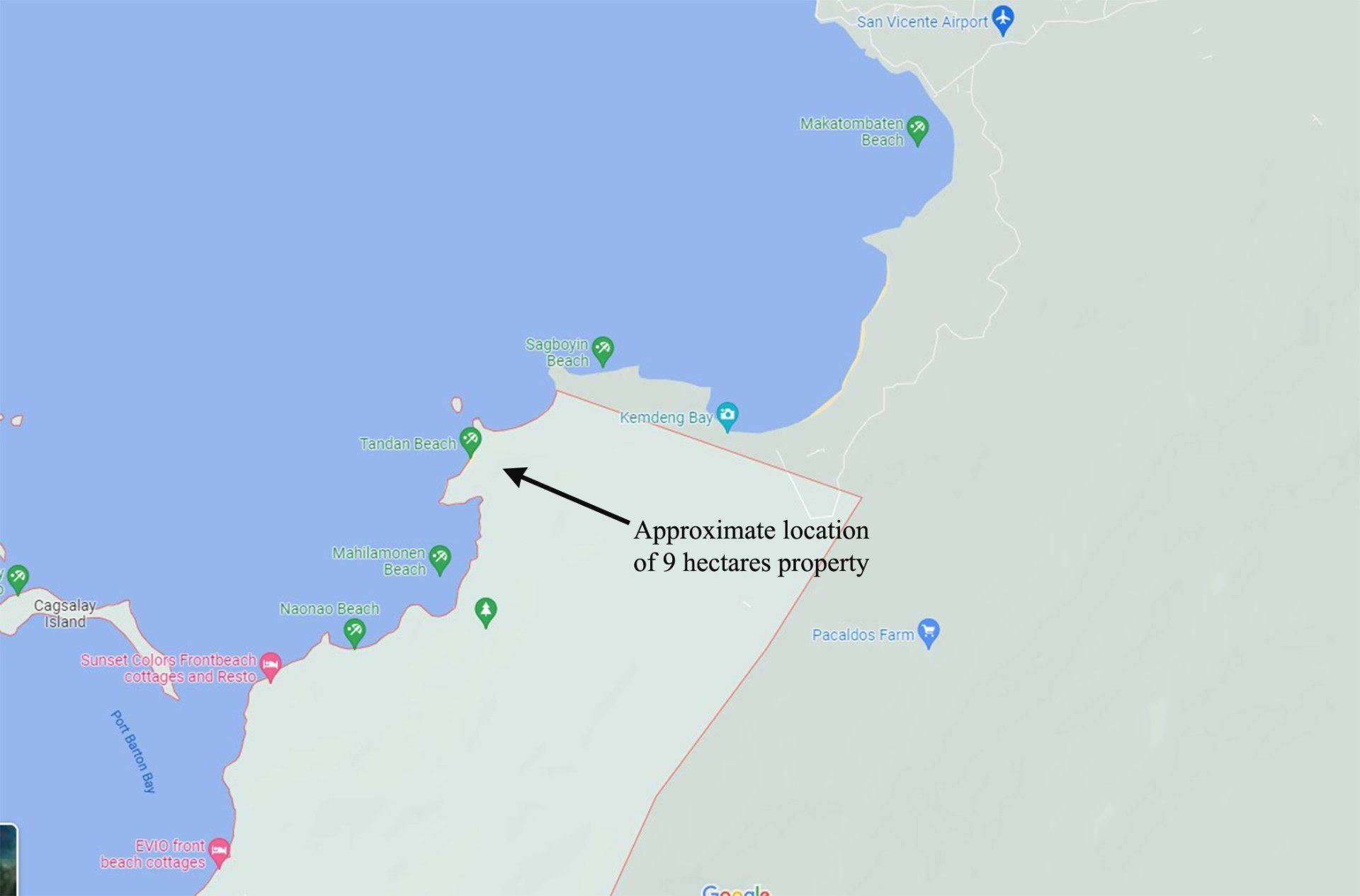 Distance: 8 kilometers to the Megaworld Paragua Coastal Town in Kemdeng, 8 kilometers to the tourist area of Port Barton, and 12 kilometers to the airport of San Vicente.
